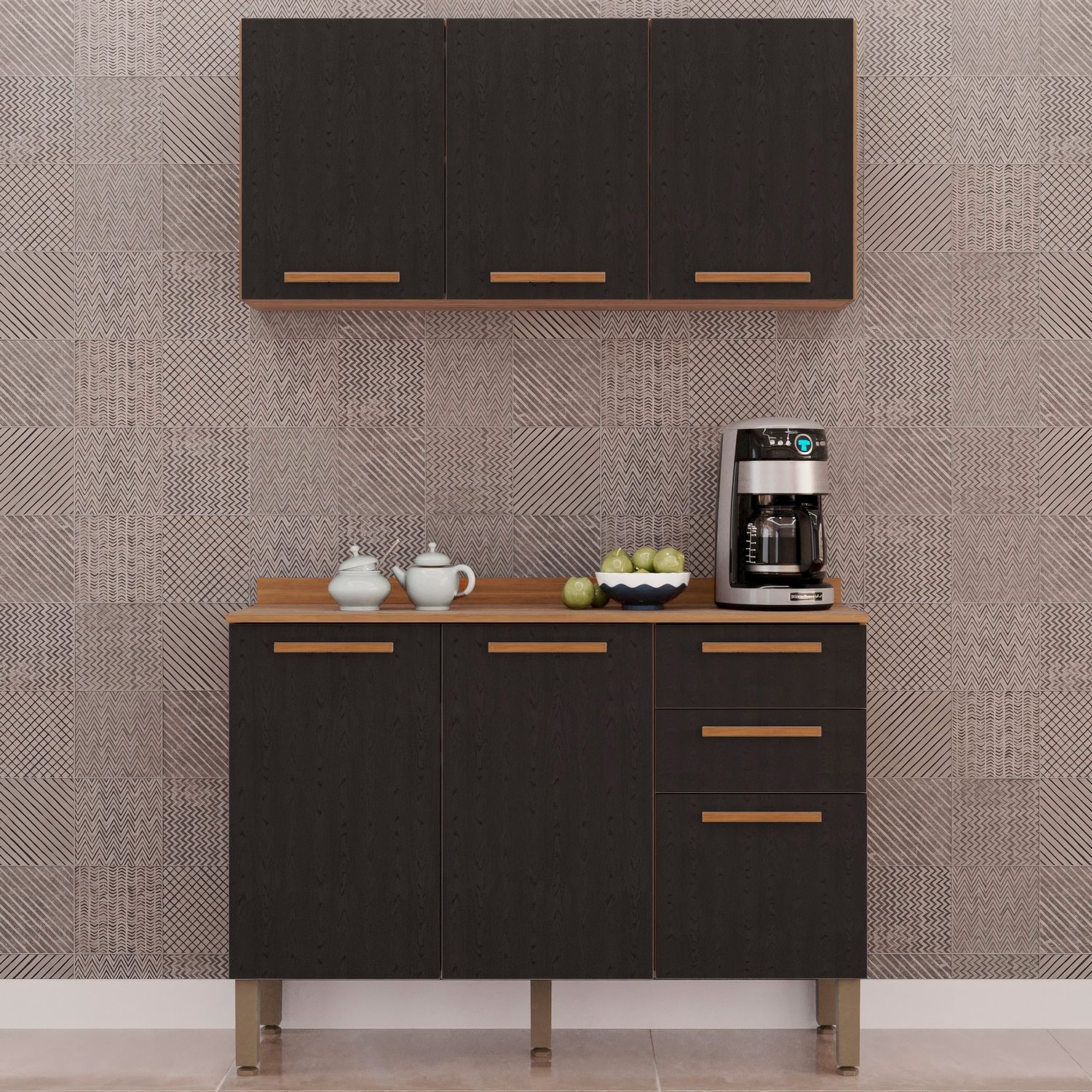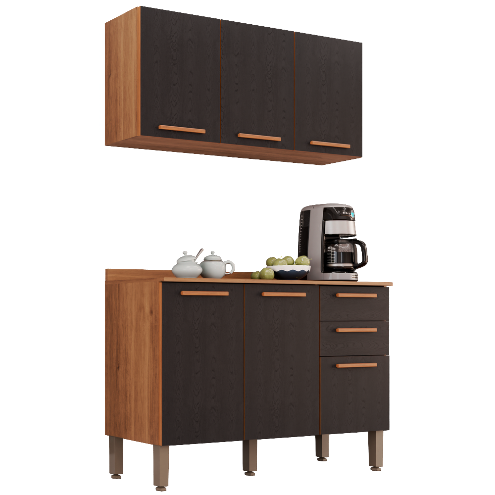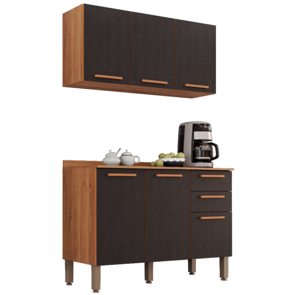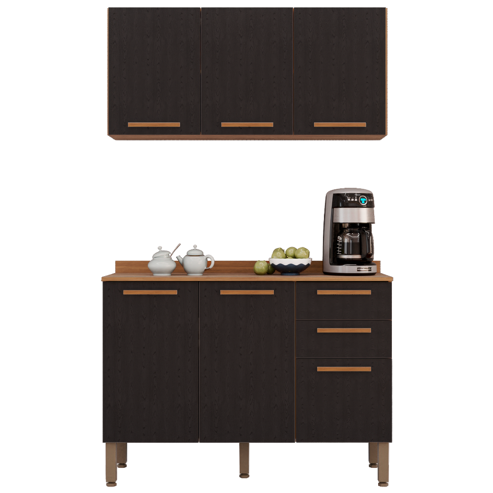 Armário Aéreo Triplo + Balcão New Valência Cinamomo/Preto – SALLÊTO