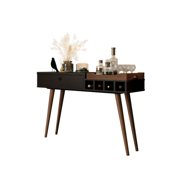 – Uma gaveta com detalhe ripado e corrediças telescópicas