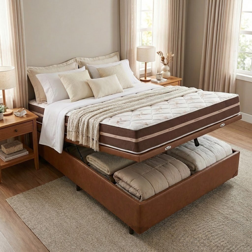 Colchão Casal Classic 22 cm AGD70 Molas Ensacadas + Base Baú Corino Marrom – ANJOS COLCHÕES + ALTO NÍVEL