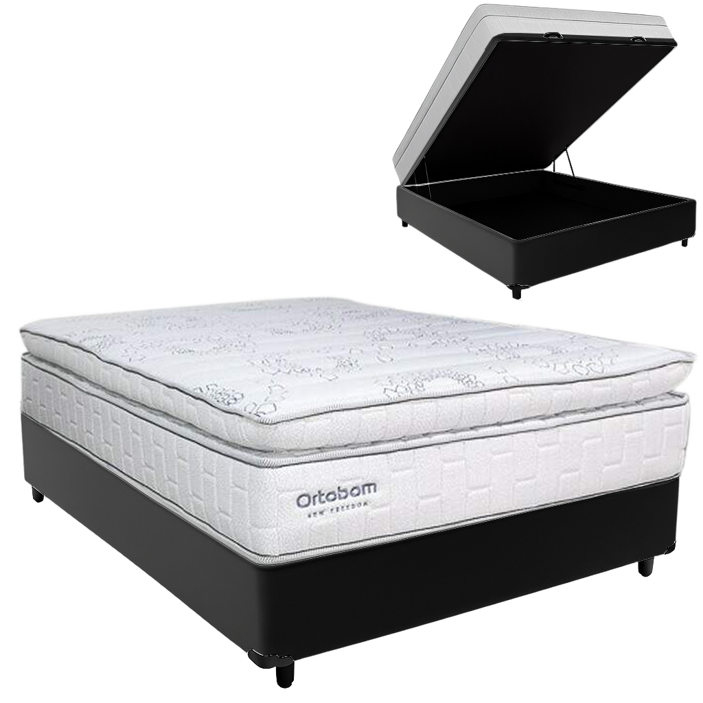 Colchão Casal New Freedom 32 cm D33 Molas Ensacadas + Base Baú Corino Preto – ORTOBOM + ALTO NÍVEL