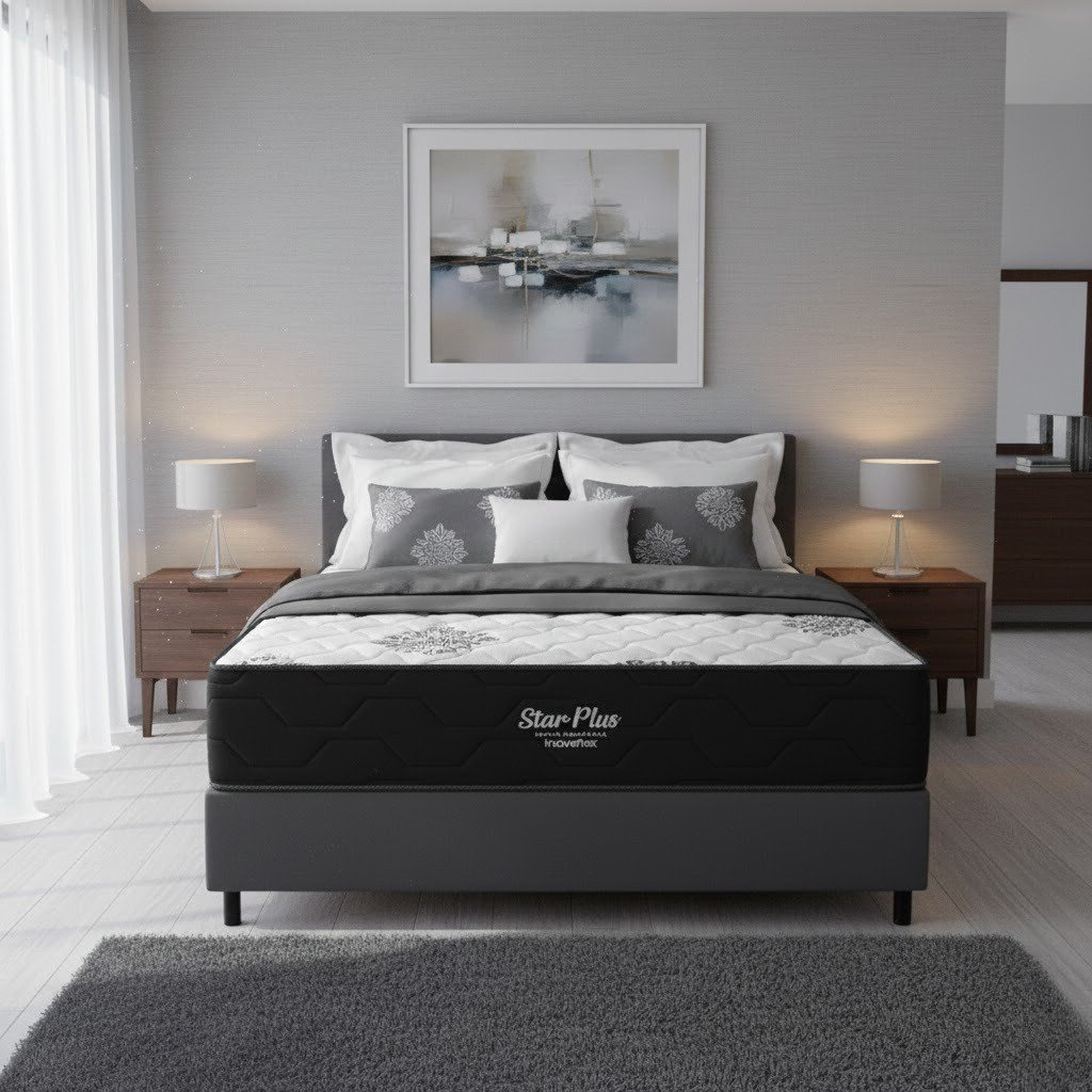 Colchão Casal Star Plus D26 + Base Box Simples Corino Preto – INOVAFLEX + BIOSTAR