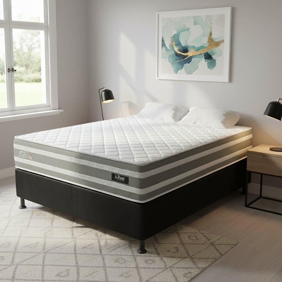 Colchão Casal Talismã D28 + Base Box Simples Corino Preto – DESIGN COLCHÕES + ALTO NÍVEL CAMAS E COLCHÕES