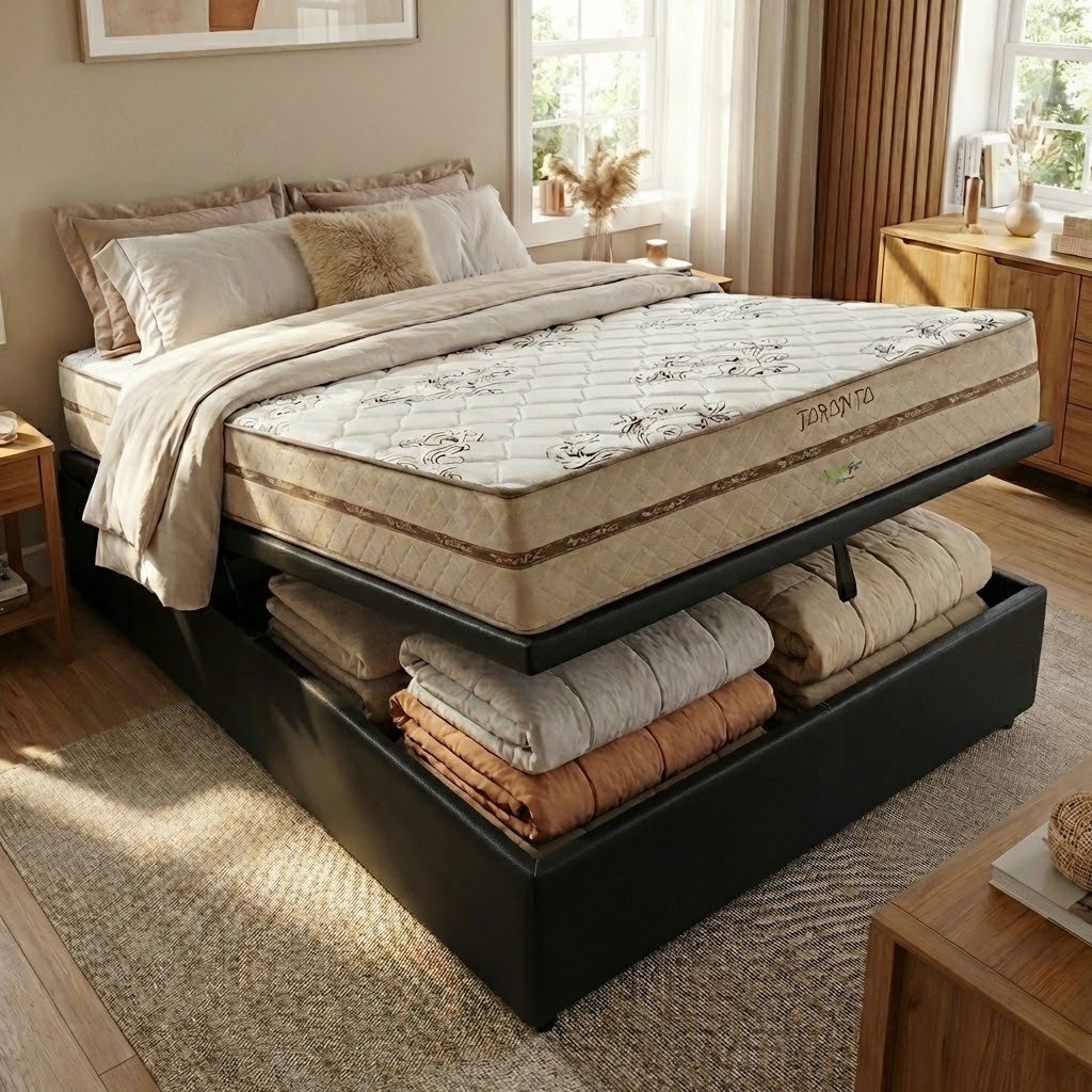 Colchão Casal Toronto D28 + Base Box Baú Corino Preto – ECOTEC + ALTO NÍVEL CAMAS E COLCHÕES
