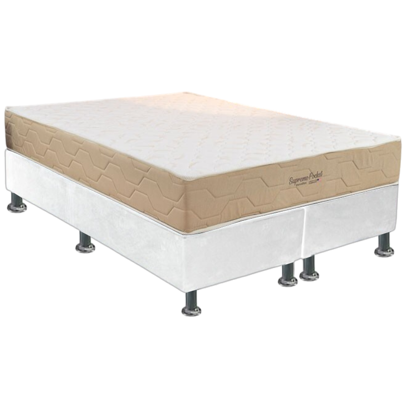 Colchão Queen Supreme Pocket D26 + Base Box Simples Corino Branco – INOVAFLEX + ALTO NÍVEL CAMAS E COLCHÕES