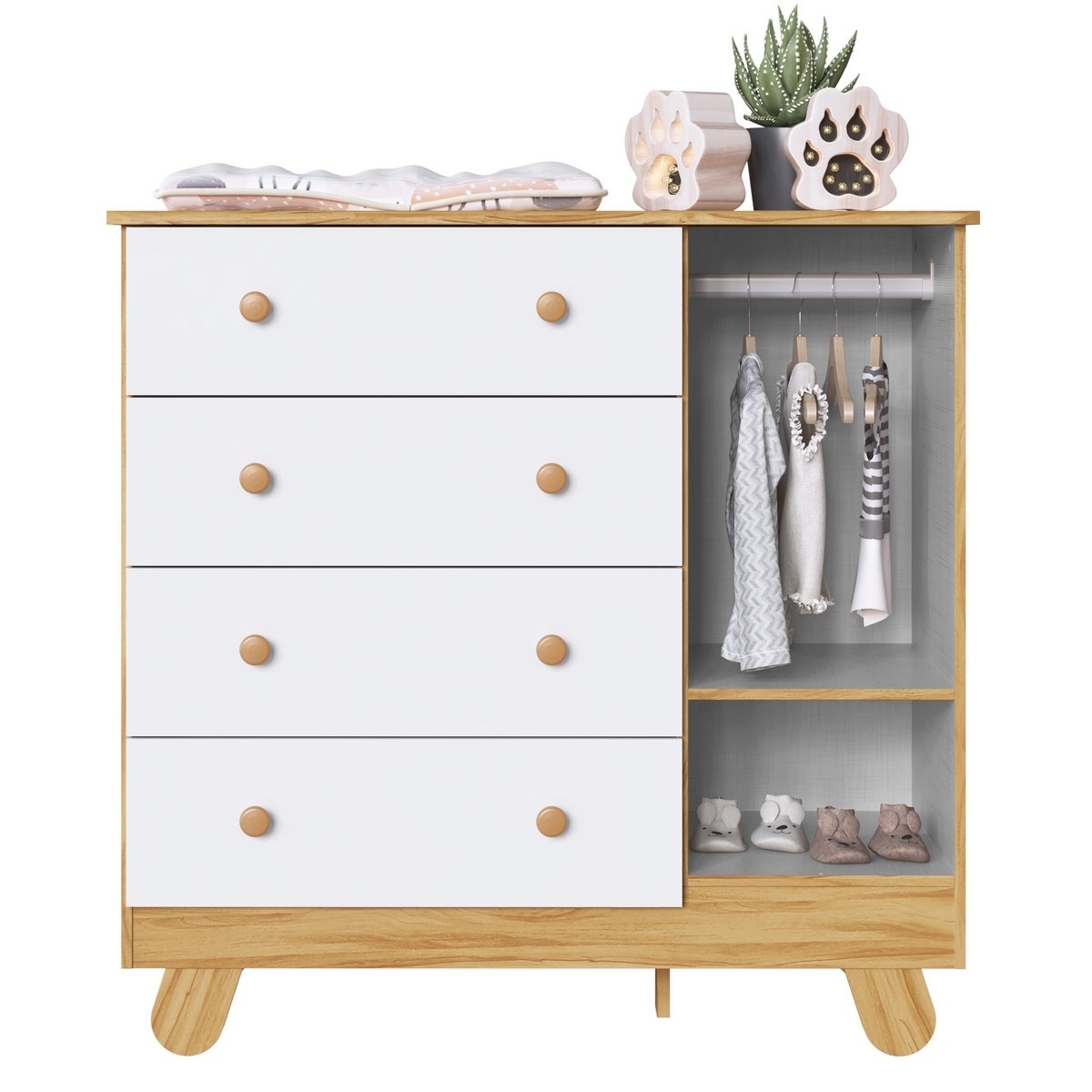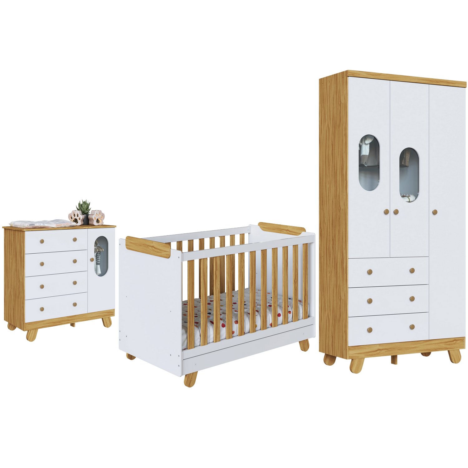 Guarda-Roupa 3 Portas + Cômoda + Berço Pingo Amêndoa/Branco Brilho – PEROBA MÓVEIS