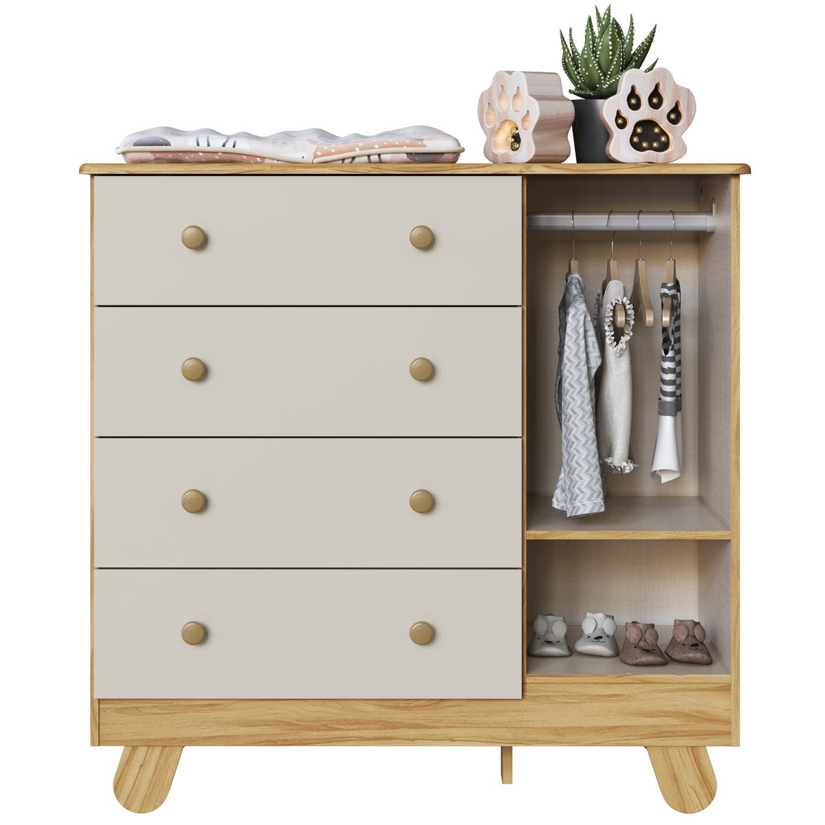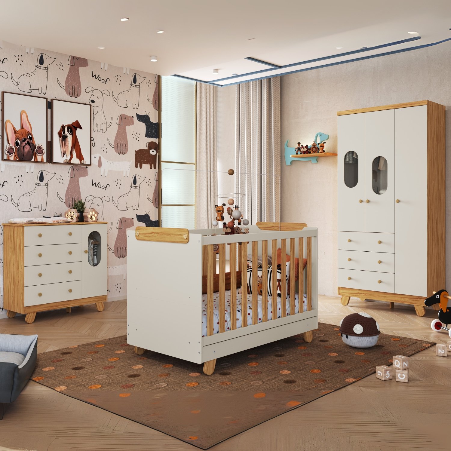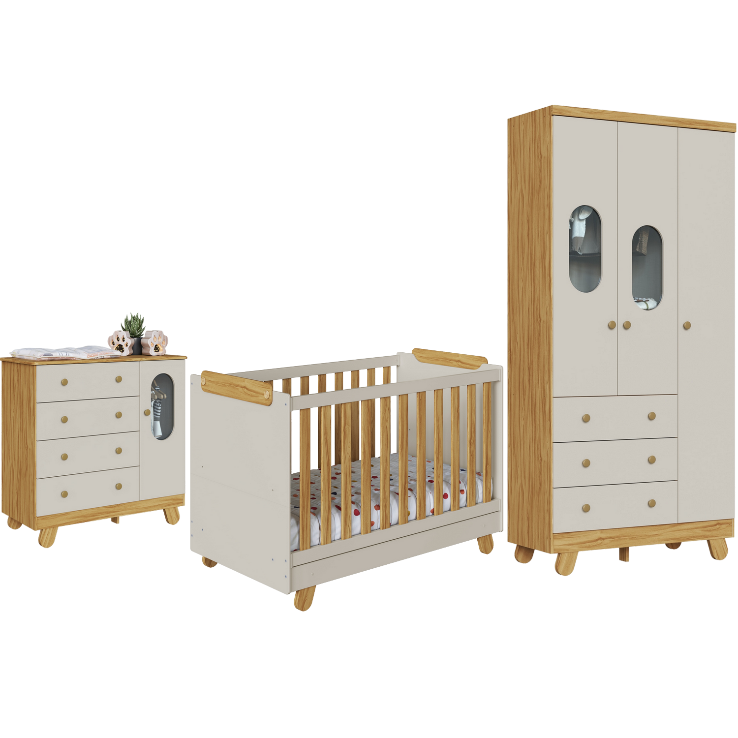 Guarda-Roupa 3 Portas + Cômoda + Berço Pingo Amêndoa/Off White – PEROBA MÓVEIS