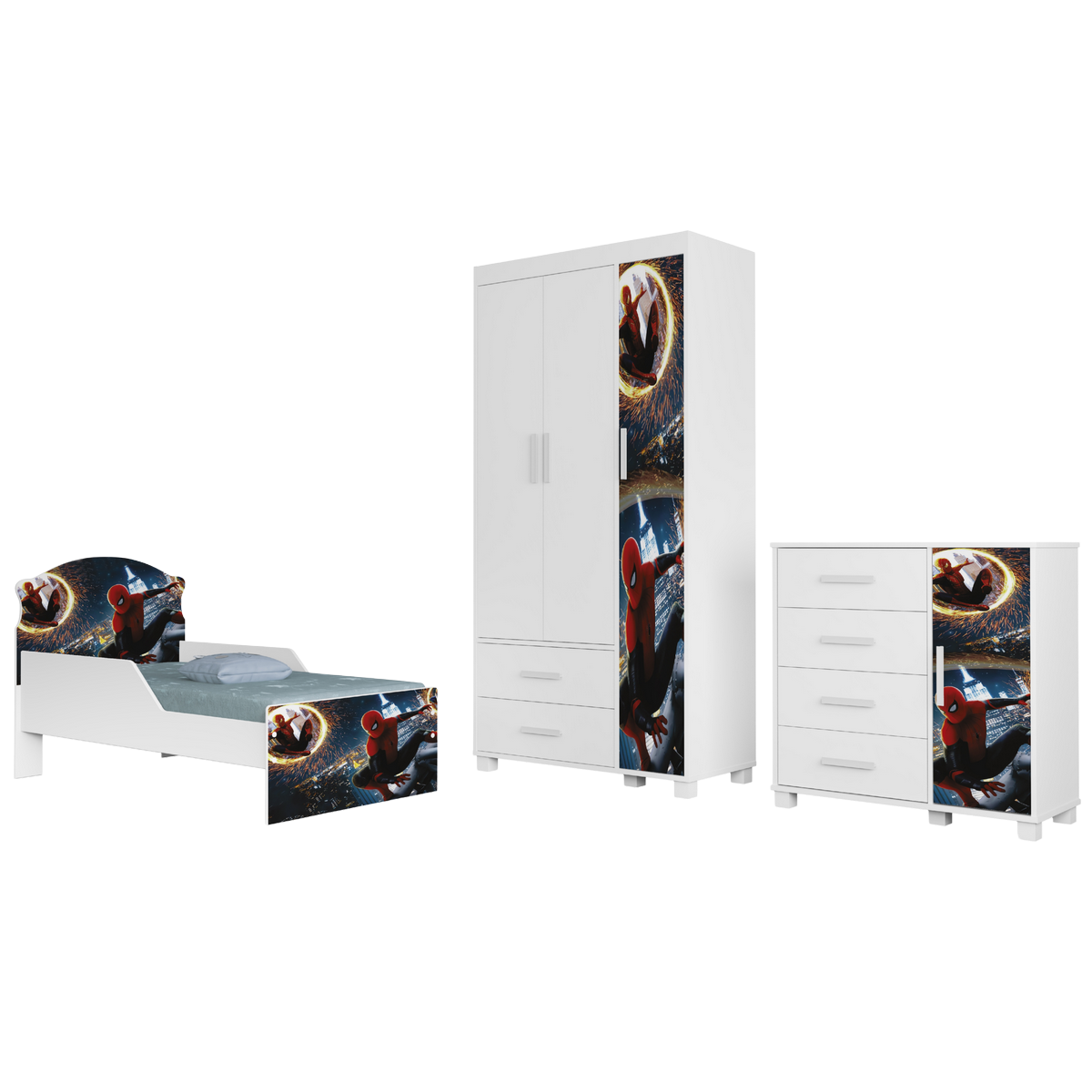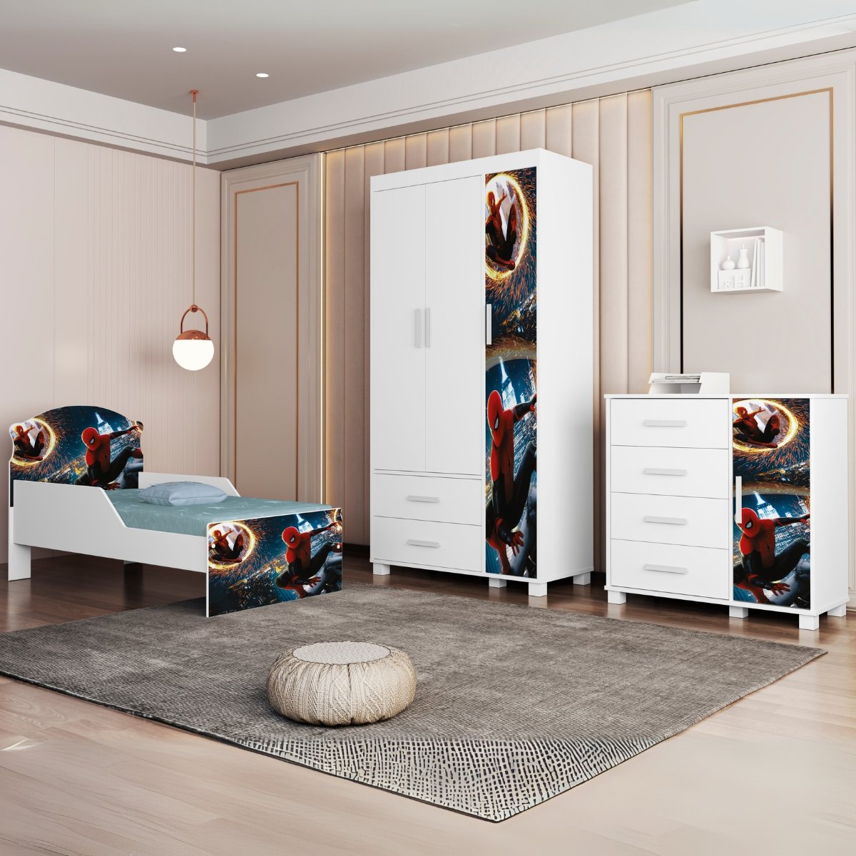 Guarda-Roupa 3 Portas Lívia + Cômoda 4 Gavetas com Sapateira Lívia + Mini Cama Juvenil Lívia (Menino) Homem-Aranha 14 – MADEC/VJ MÓVEIS