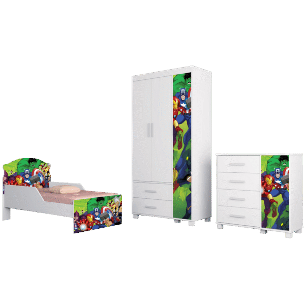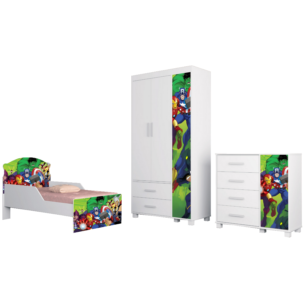 Guarda-Roupa 3 Portas Lívia + Cômoda 4 Gavetas com Sapateira Lívia + Mini Cama Juvenil Lívia (Menino) Vingadores 404188 – MADEC/VJ MÓVEIS