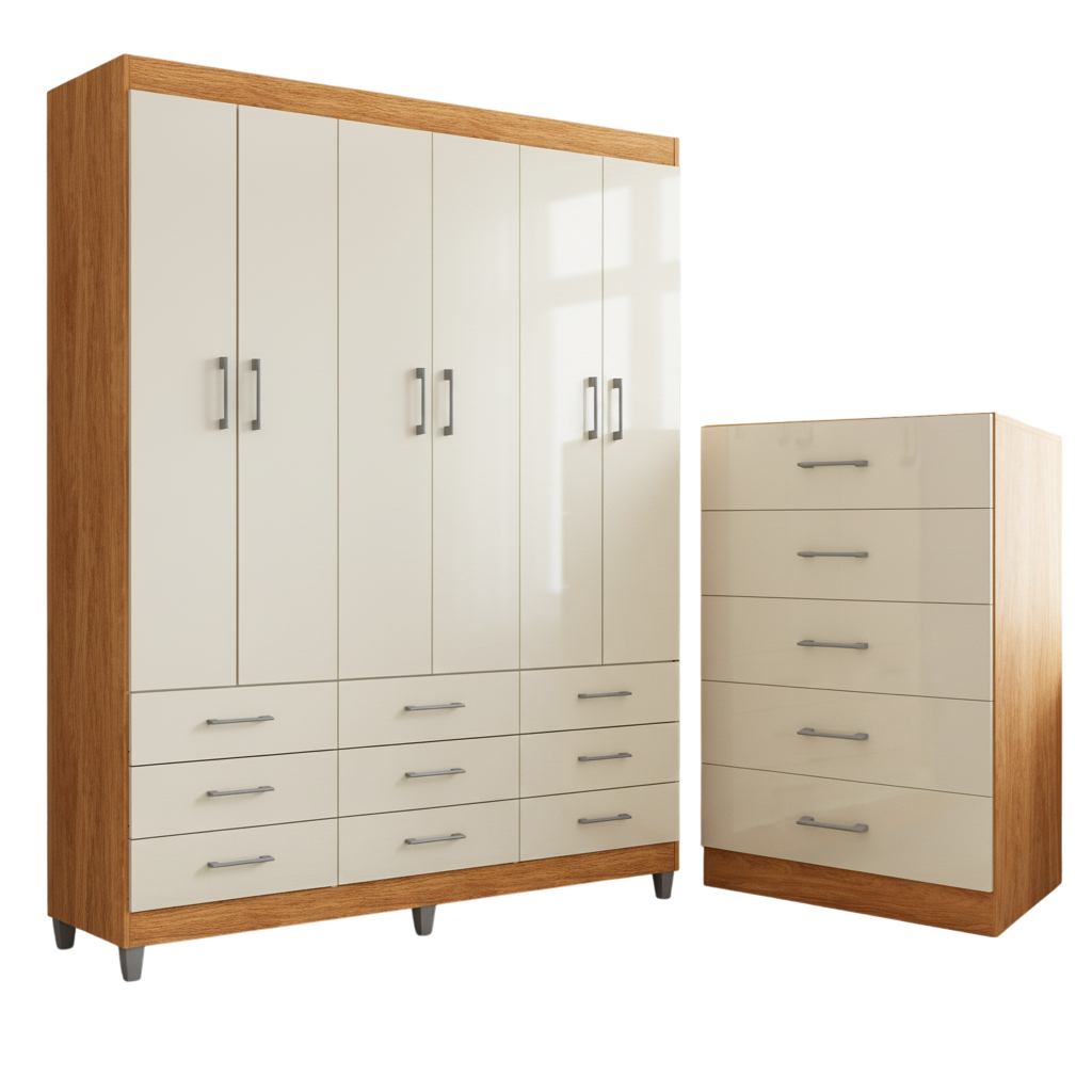 Guarda-Roupa 6 Portas Paraty 3690 + Cômoda 5 Gavetas Aruba Cinamomo/Off White – FELLICCI