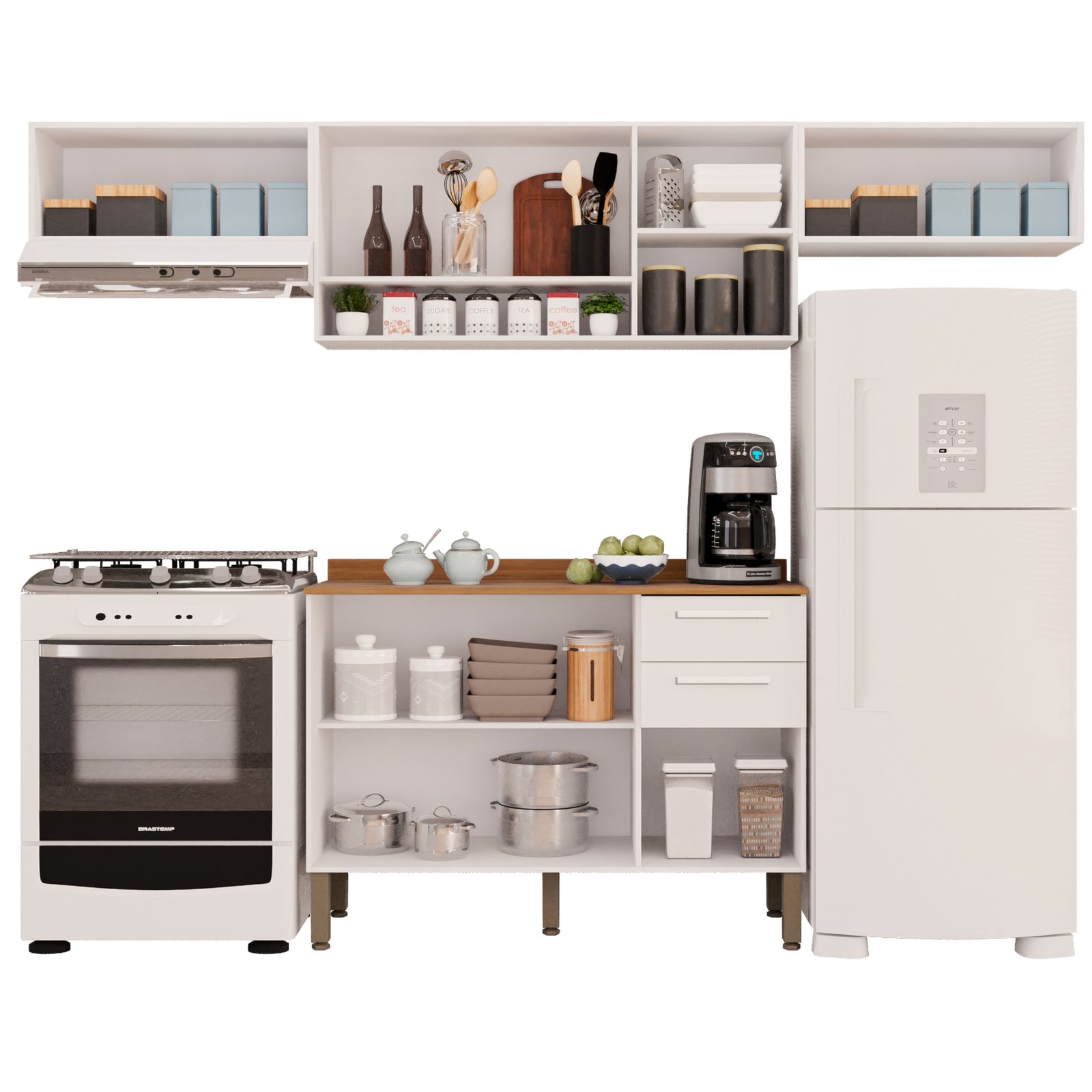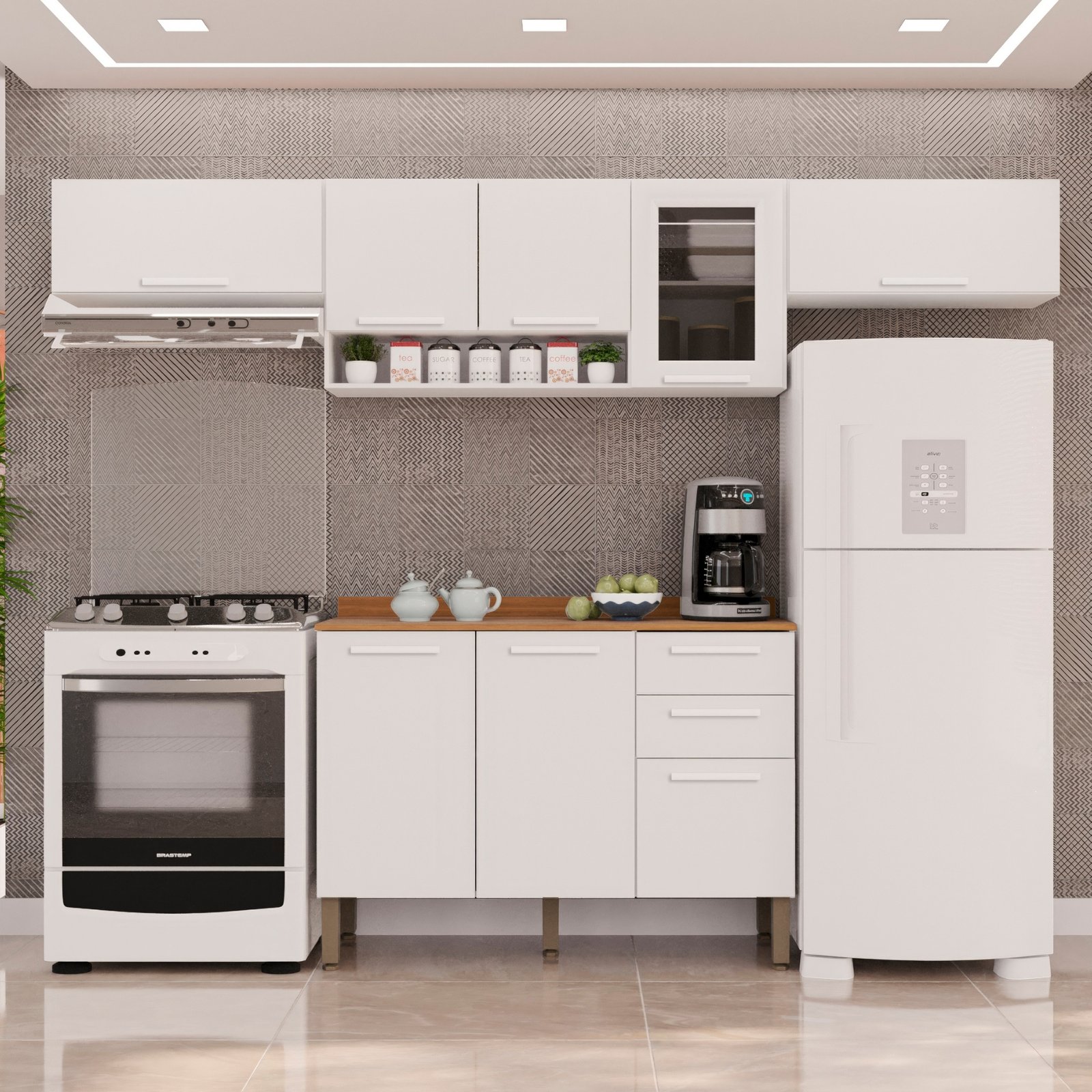 Kit 2 Armário Aéreo Geladeira + 1 Armário Aéreo Vidro Fumê + 1 Balcão New Valência Branco – SALLÊTO