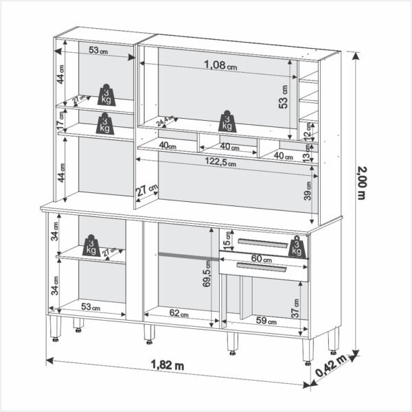 – Seis portas com dobradiças de pressão, sendo duas com vidro