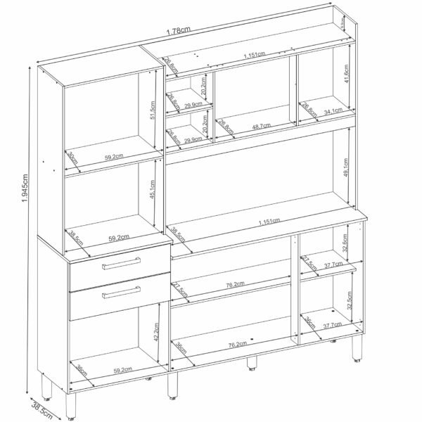 – Espaço para microondas 45 cm x 59 cm x 38 cm (AxLxP)