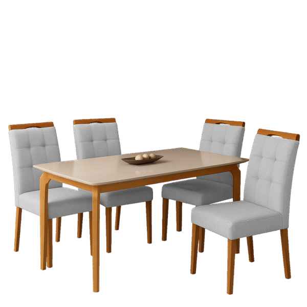 Mesa Alegra 120 Cinamomo/Off White com 4 Cadeiras Sophia Linho Cinza Prata 206 – JCM MOVELARIA + WM DECOR