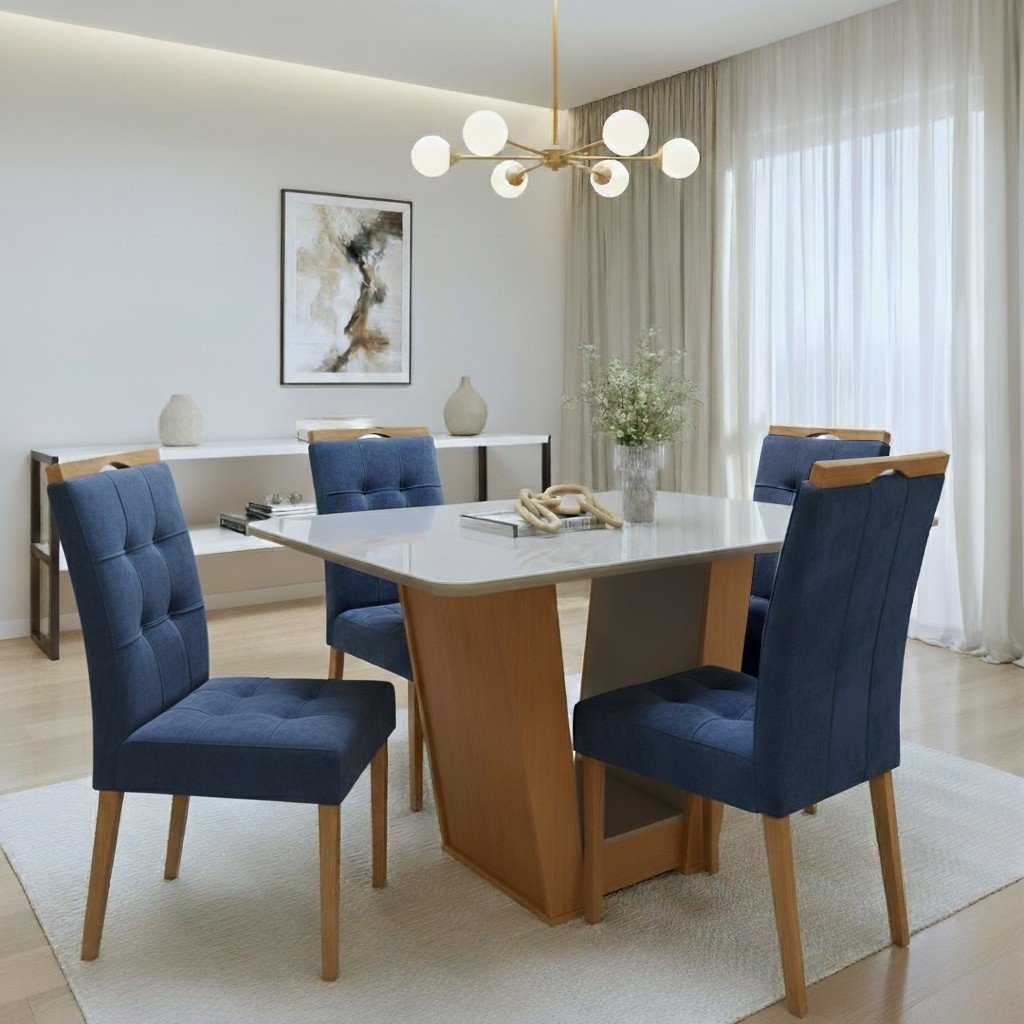 Mesa Apogeu (Tampo Maxi) 120 Amêndoa Clean/Off White com 4 Cadeiras Sophia Veludo Azul – LOPAS + WM DECOR