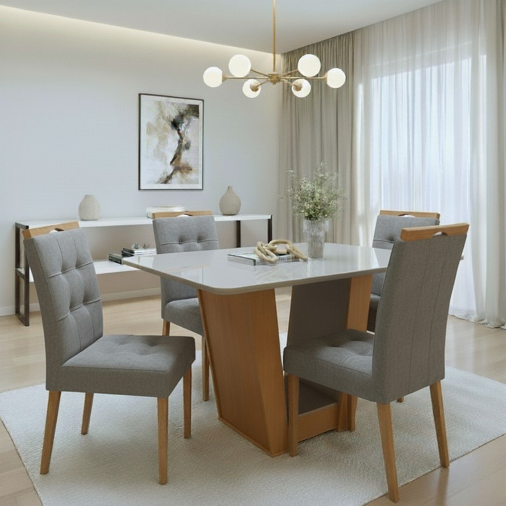 Mesa Apogeu (Tampo Maxi) 120 Amêndoa Clean/Off White com 4 Cadeiras Sophia Veludo Cinza Grafite – LOPAS + WM DECOR