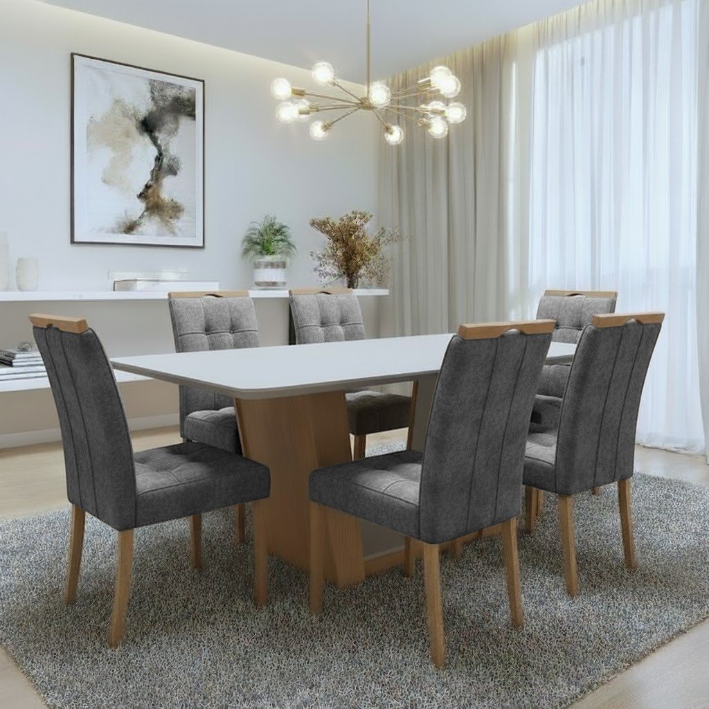Mesa Apogeu (Tampo Maxi) 170 Amêndoa Clean/Off White com 6 Cadeiras Sophia Veludo Cinza Grafite – LOPAS + WM DECOR