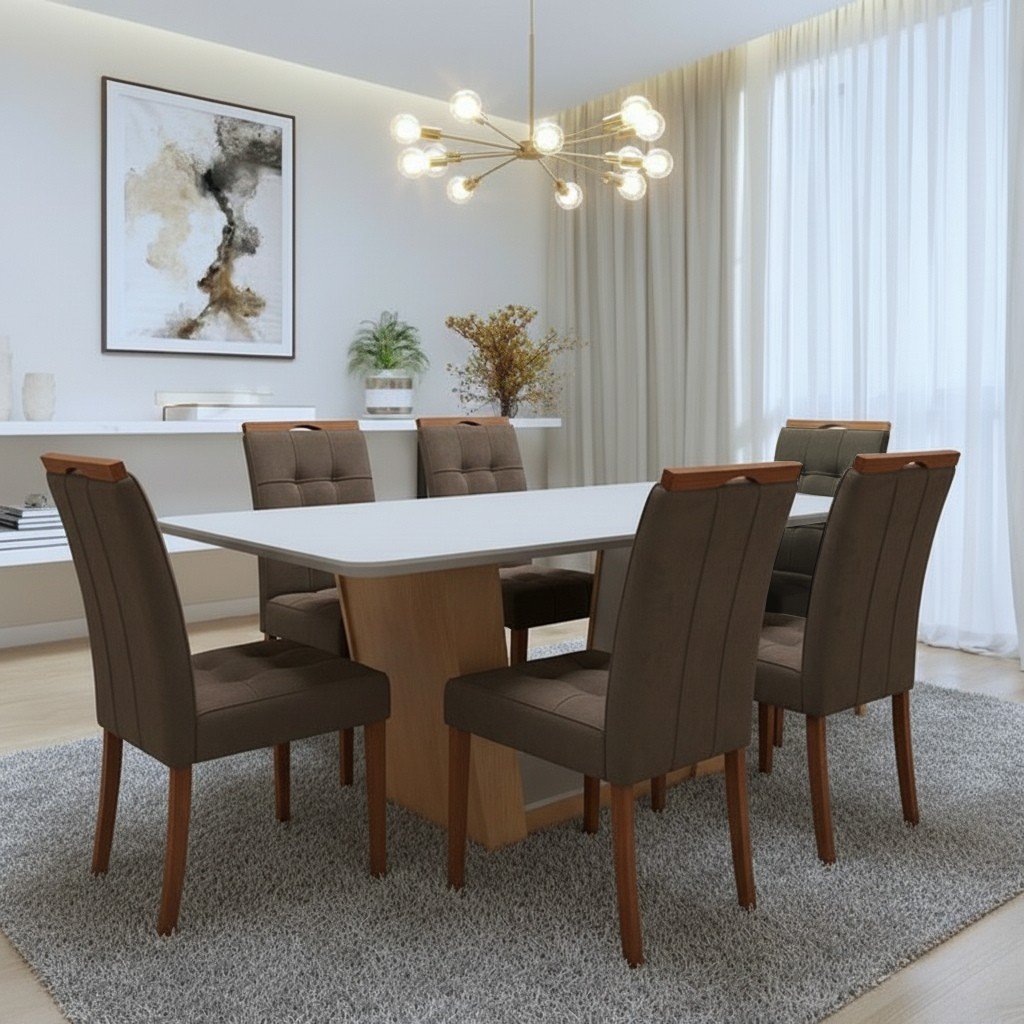 Mesa Apogeu (Tampo Maxi) 170 Amêndoa Clean/Off White com 6 Cadeiras Sophia Veludo Marrom – LOPAS + WM DECOR