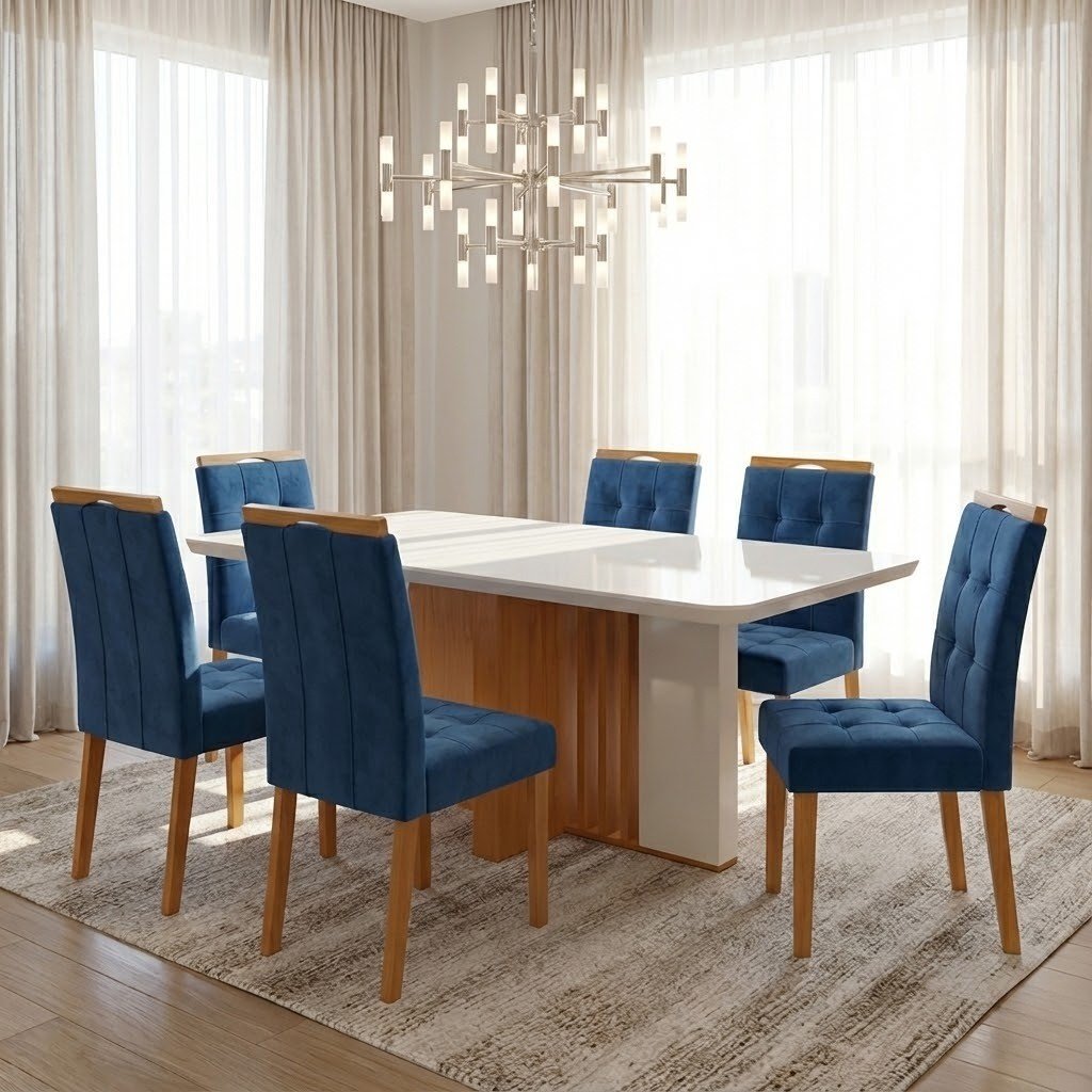 Mesa Astrid (Tampo Maxi) 170 Amêndoa Clean/Off White com 6 Cadeiras Sophia Veludo Azul – LOPAS + WM DECOR