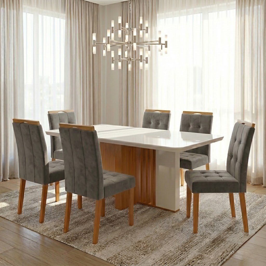 Mesa Astrid (Tampo Maxi) 170 Amêndoa Clean/Off White com 6 Cadeiras Sophia Veludo Cinza Grafite – LOPAS + WM DECOR