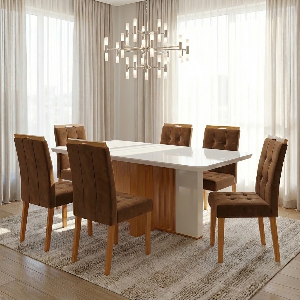 Mesa Astrid (Tampo Maxi) 170 Amêndoa Clean/Off White com 6 Cadeiras Sophia Veludo Marrom – LOPAS + WM DECOR