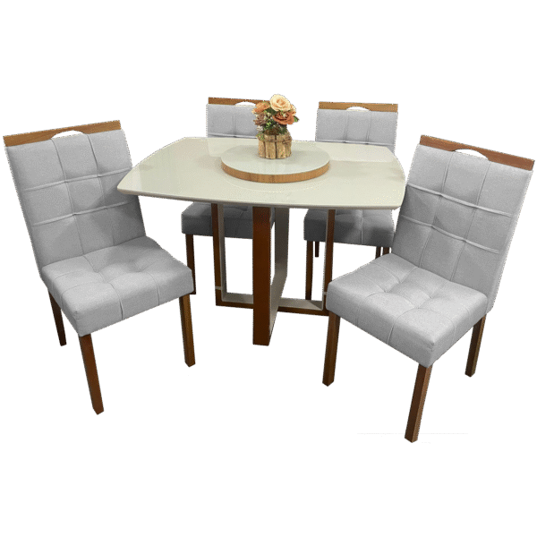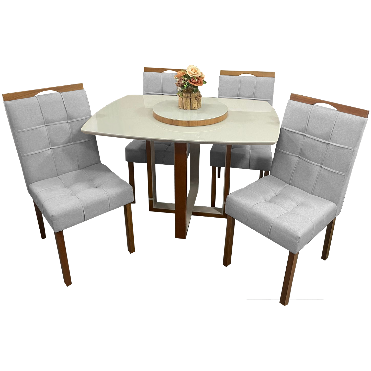 Mesa Atlas Mel/Off White Canto Barril 120×90 com 4 Cadeiras Sophia Mel/Linho Cinza Grafite 202 – ART ASSENTOS + WM DECOR