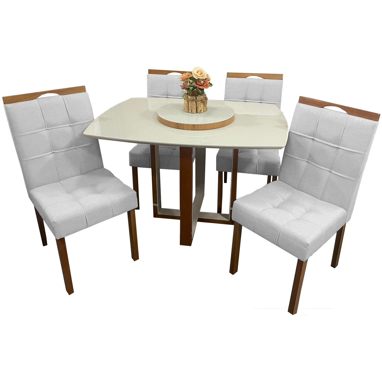 Mesa Atlas Mel/Off White Canto Barril 120×90 com 4 Cadeiras Sophia Mel/Linho Cinza Prata 206 – ART ASSENTOS + WM DECOR