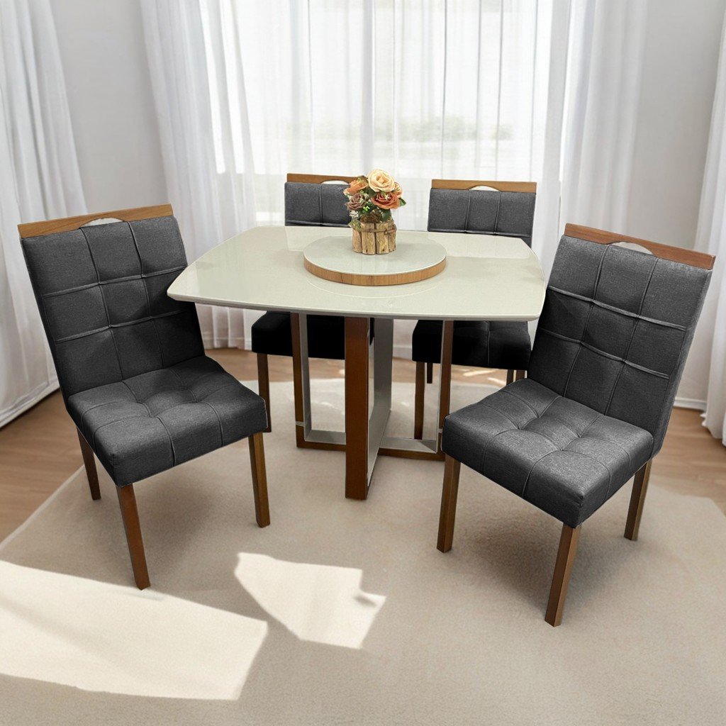 Mesa Atlas Mel/Off White Canto Barril 120×90 com 4 Cadeiras Sophia Mel/Veludo Cinza Grafite – ART ASSENTOS + WM DECOR