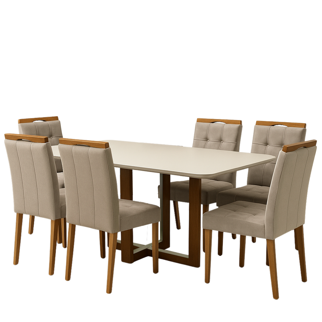 Mesa Atlas Mel/Off White Canto Copo 160×80 com 6 Cadeiras Sophia Veludo Bege – ART ASSENTOS + WM DECOR