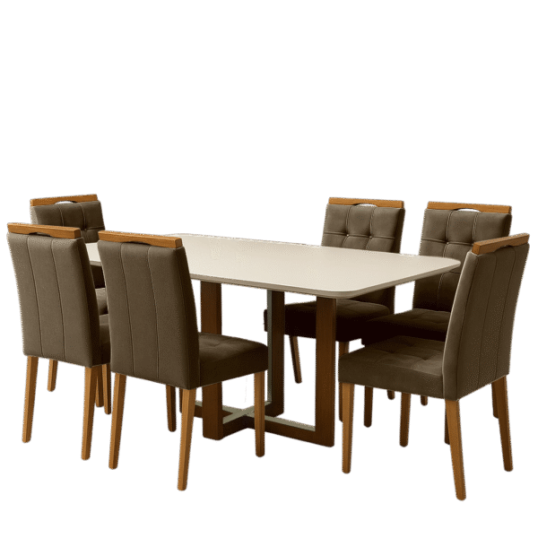 Mesa Atlas Mel/Off White Canto Copo 160×80 com 6 Cadeiras Sophia Veludo Marrom – ART ASSENTOS + WM DECOR