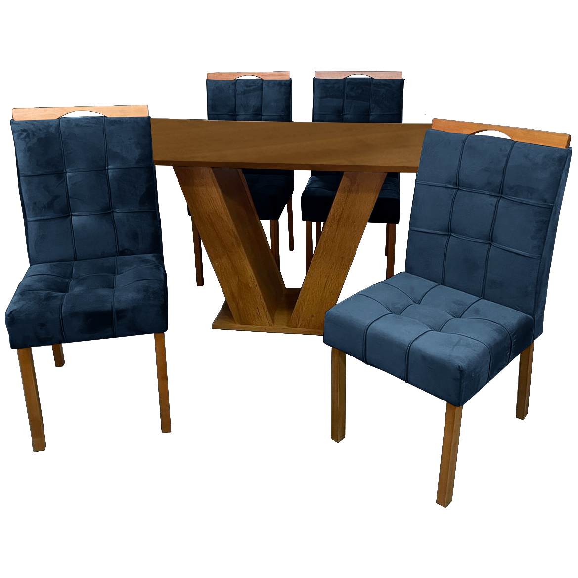 Mesa Classic 120 Cinamomo Laminado com 4 Cadeiras Sophia Mel/Veludo Azul – CEL MÓVEIS + WM DECOR