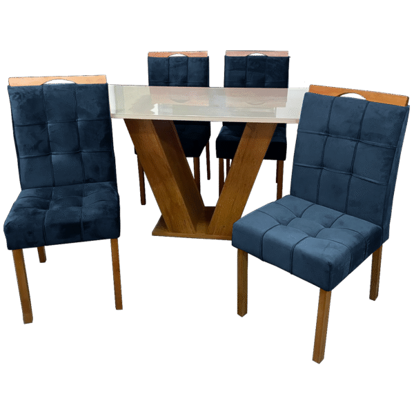 Mesa Classic 120 Cinamomo/Off White com 4 Cadeiras Sophia Mel/Veludo Azul – CEL MÓVEIS + WM DECOR