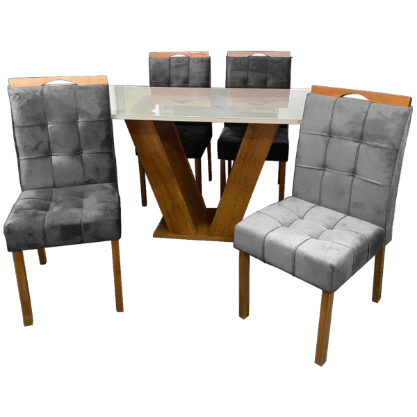 Mesa Classic 120 Cinamomo/Off White com 4 Cadeiras Sophia Mel/Veludo Cinza Grafite – CEL MÓVEIS + WM DECOR