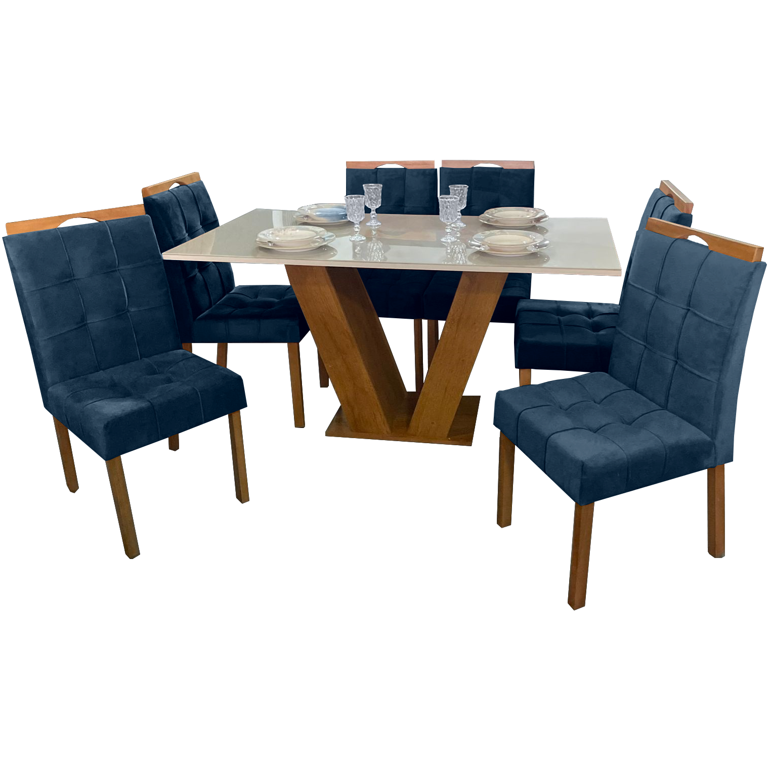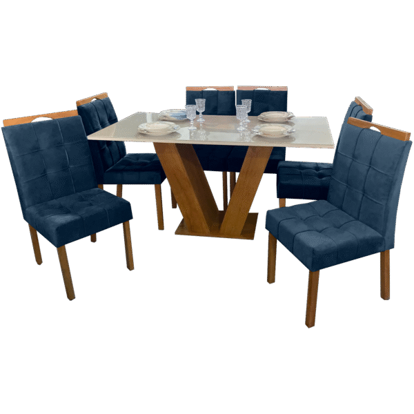 Mesa Classic 160 Cinamomo/Off White com 6 Cadeiras Sophia Mel/Veludo Azul – CEL MÓVEIS + WM DECOR