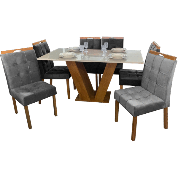 Mesa Classic 160 Cinamomo/Off White com 6 Cadeiras Sophia Mel/Veludo Grafite – CEL MÓVEIS + WM DECOR
