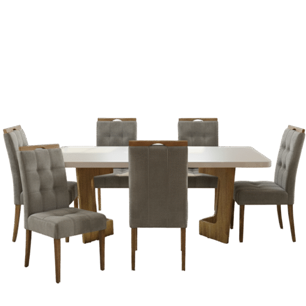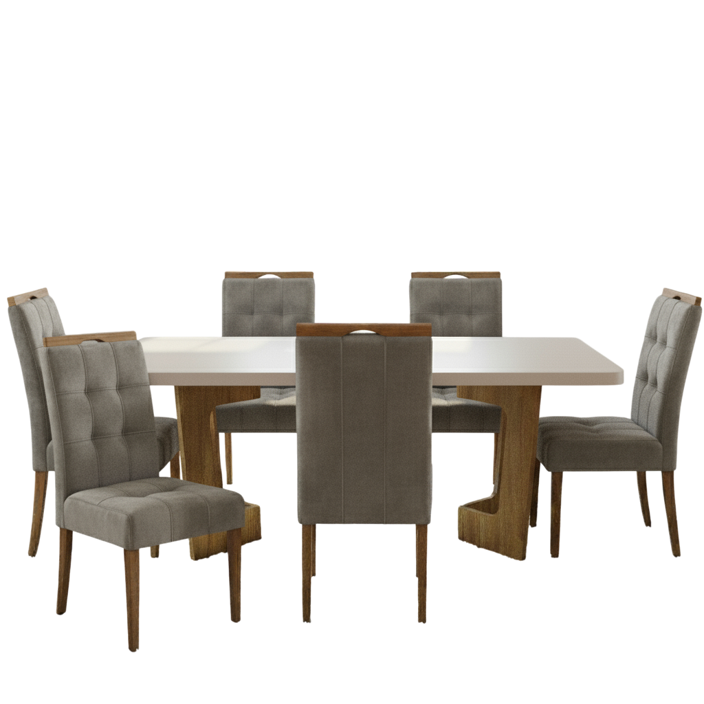 Mesa Liz 160 (Tampo 40 mm) Cinamomo/Off White com 6 Cadeiras Sophia Veludo Cinza Grafite – VALDEMÓVEIS + WM DECOR