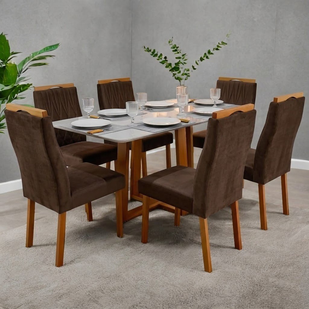 Mesa Pedro 160 Mel/Off White com 6 Cadeiras Gênova Veludo Marrom – ART ASSENTOS