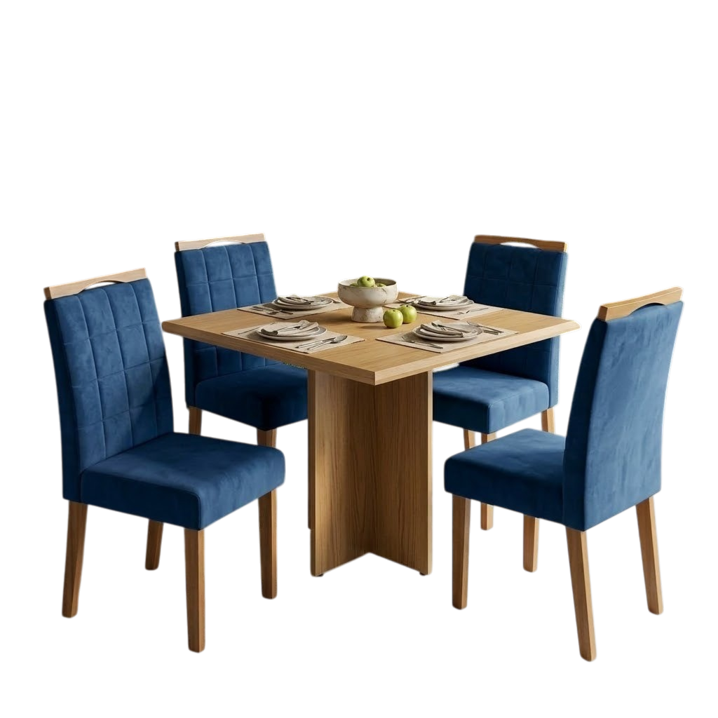 Mesa Pérola 90 Imbuia Mel (Tampo Viena s/vidro) com 4 Cadeiras Las Vegas Veludo Azul 24 – CARVALHO DECOR + OURO DECOR