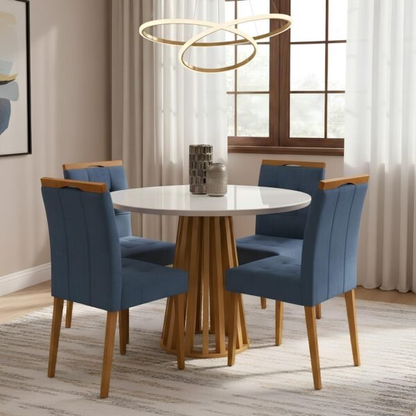 Mesa Redonda Berlim 100 Cinamomo/Off White com 4 Cadeiras Sophia Veludo Azul – CEL MÓVEIS + WM DECOR