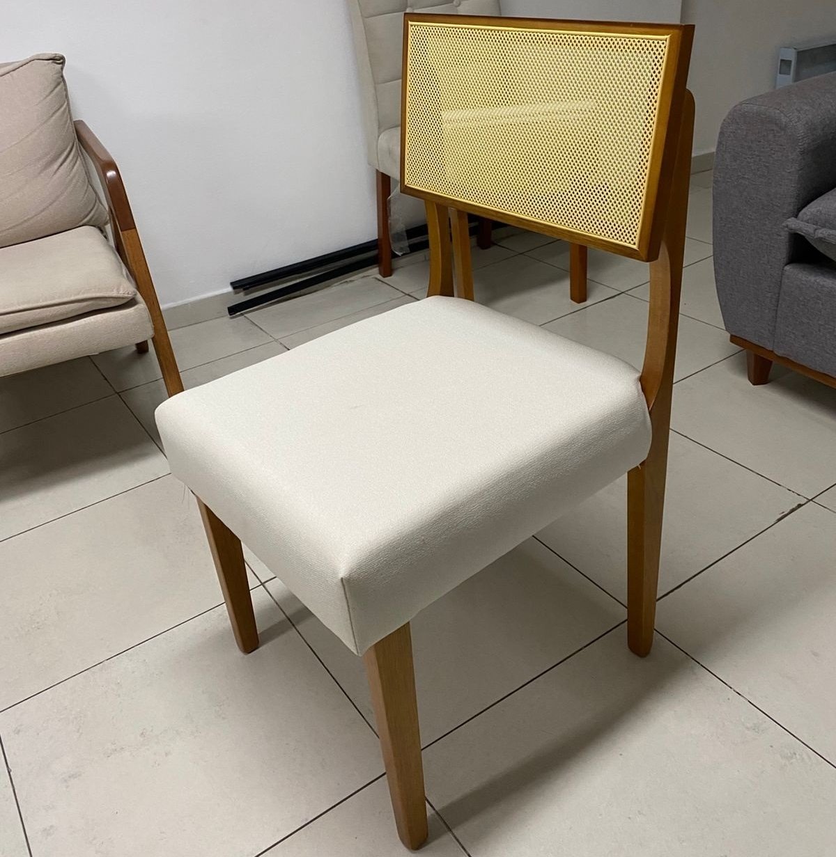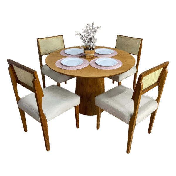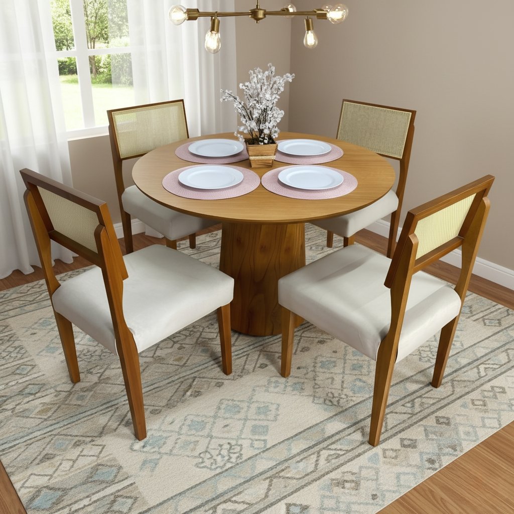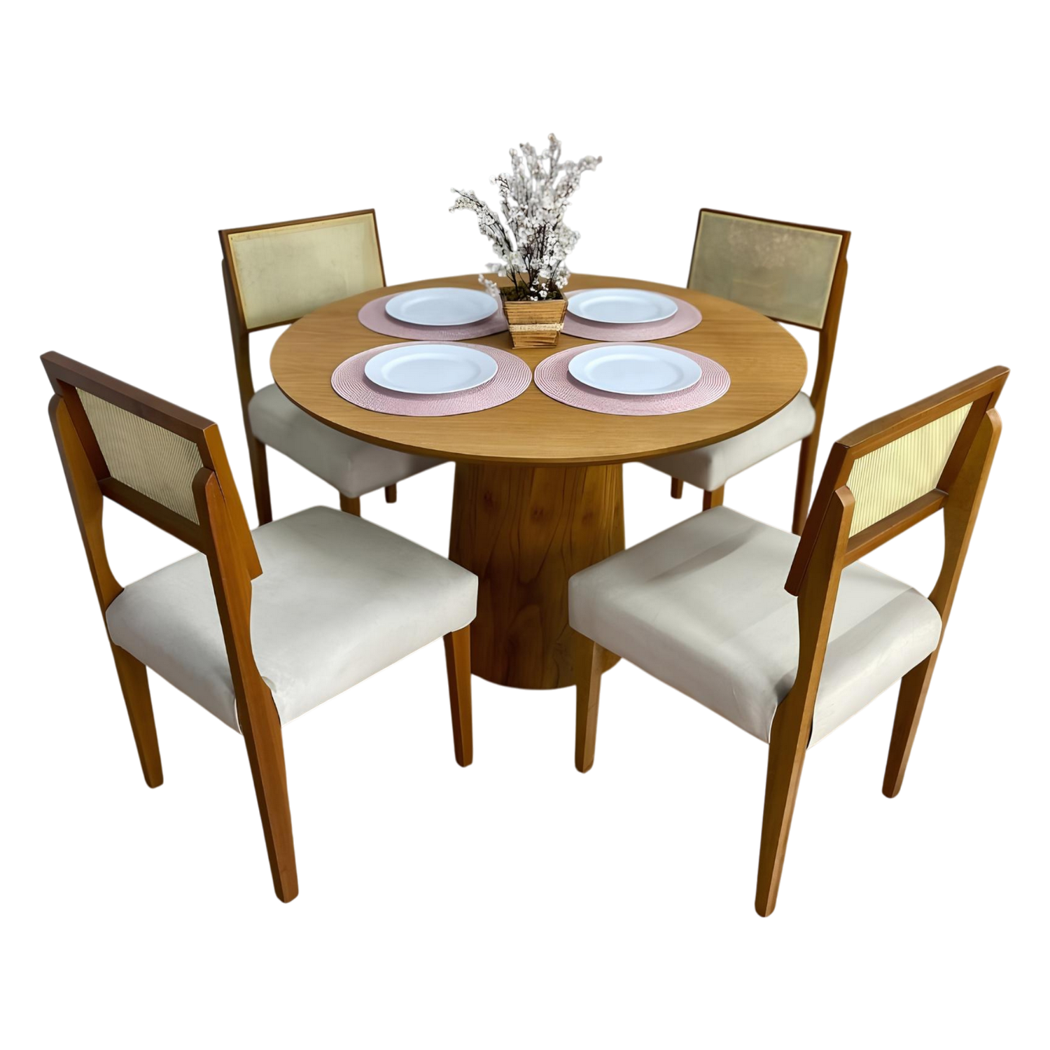 Mesa Redonda Malva 110 Mel com 4 Cadeiras Grécia Mel/Linho Bege – J SILVA MÓVEIS + HR MOVELARIA