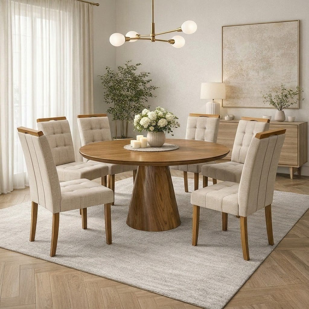 Mesa Redonda Malva 130 Mel com 6 Cadeiras Sophia Linho Bege 200 – J SILVA MÓVEIS + WM DECOR