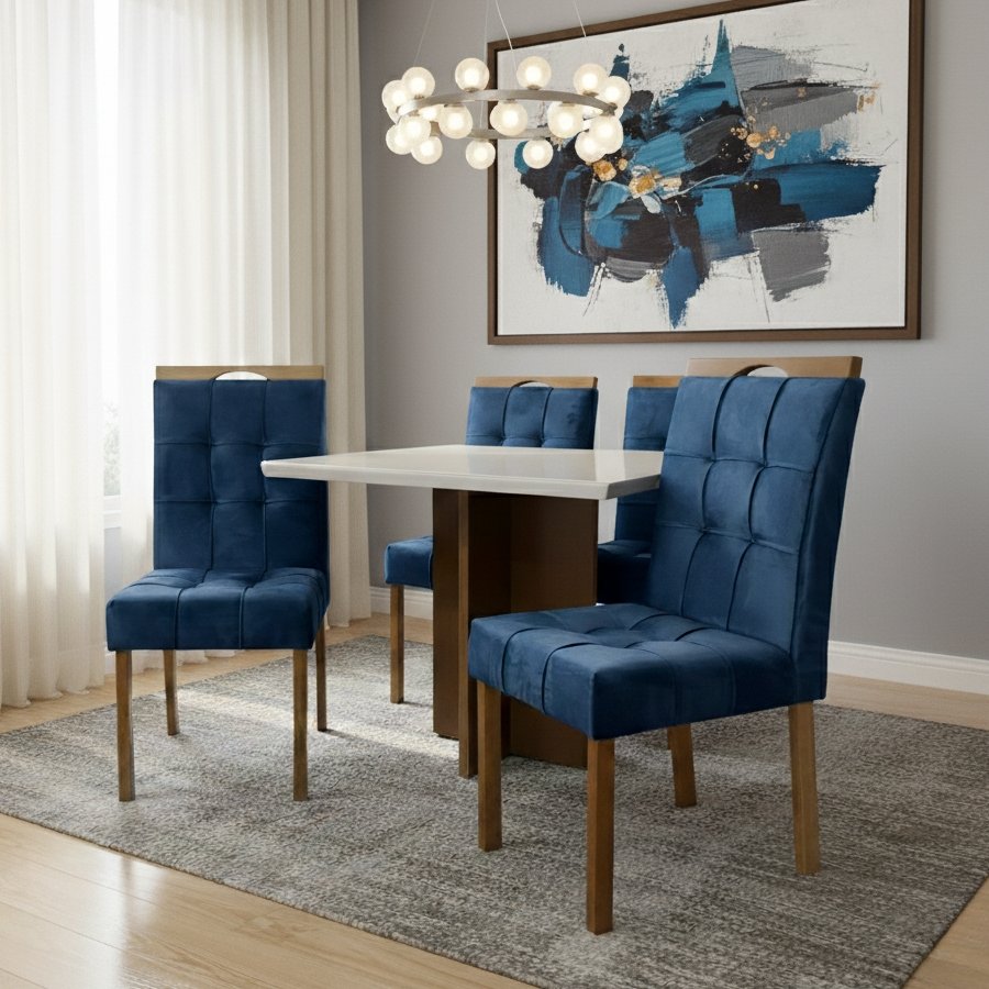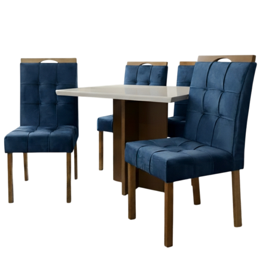 Mesa Salinas 90 Cinamomo/Off White com 4 Cadeiras Sophia Veludo Azul – CEL MÓVEIS + WM DECOR