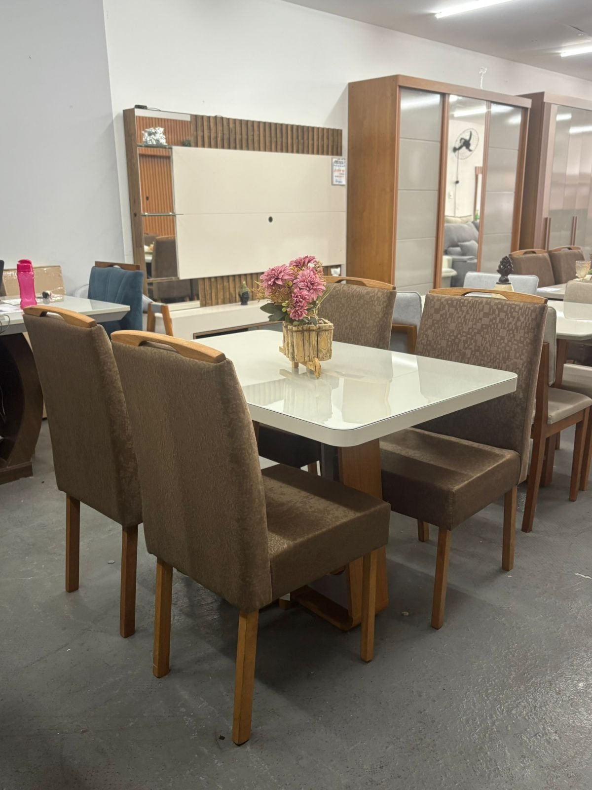 Mesa Sintonia (Tampo Maxi) 120 Amêndoa Clean/Off White + 4 Cadeiras Priscila Veludo Marrom 1015 – LOPAS + AVALON DECOR