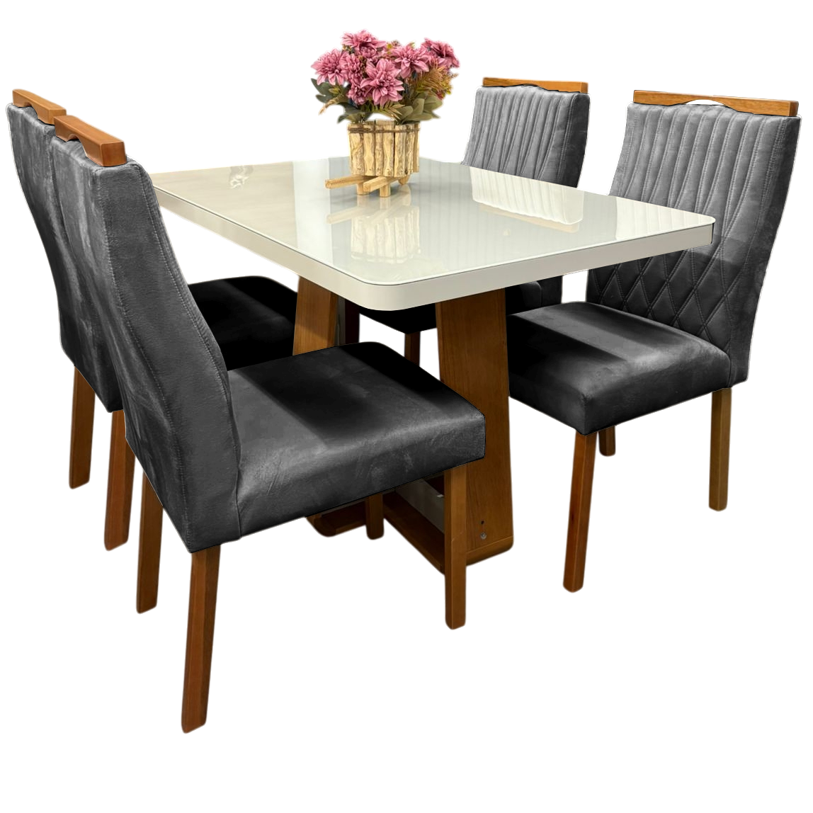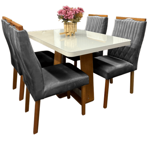 Mesa Sintonia (Tampo Maxi) 120 Amêndoa Clean/Off White com 4 Cadeiras Gênova Veludo Grafite – LOPAS + ART ASSENTOS