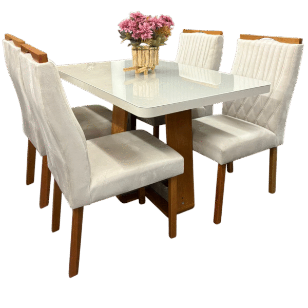Mesa Sintonia (Tampo Maxi) 120 Amêndoa Clean/Off White com 4 Cadeiras Gênova Veludo Marfim – LOPAS + ART ASSENTOS