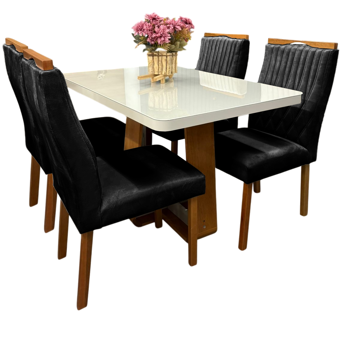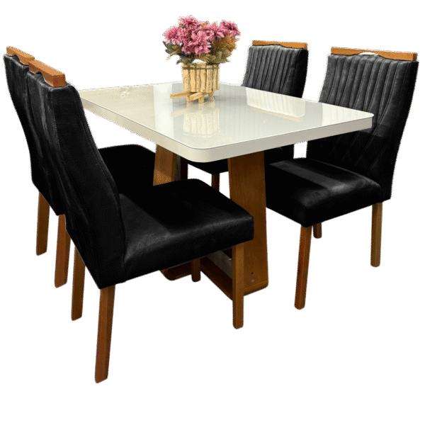 Mesa Sintonia (Tampo Maxi) 120 Amêndoa Clean/Off White com 4 Cadeiras Gênova Veludo Preto – LOPAS + ART ASSENTOS