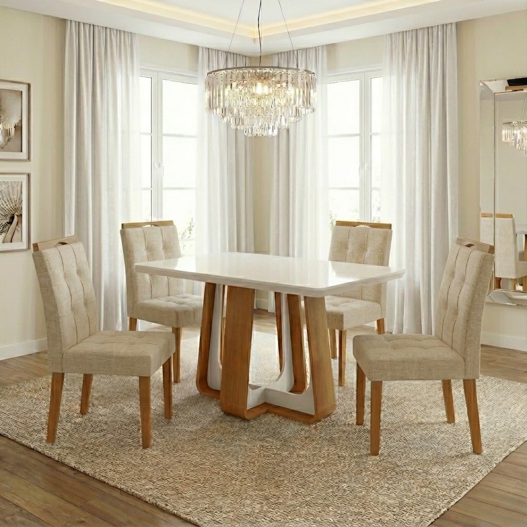 Mesa Sintonia (Tampo Maxi) 120 Amêndoa Clean/Off White com 4 Cadeiras Sophia Linho Bege 200 – LOPAS + WM DECOR