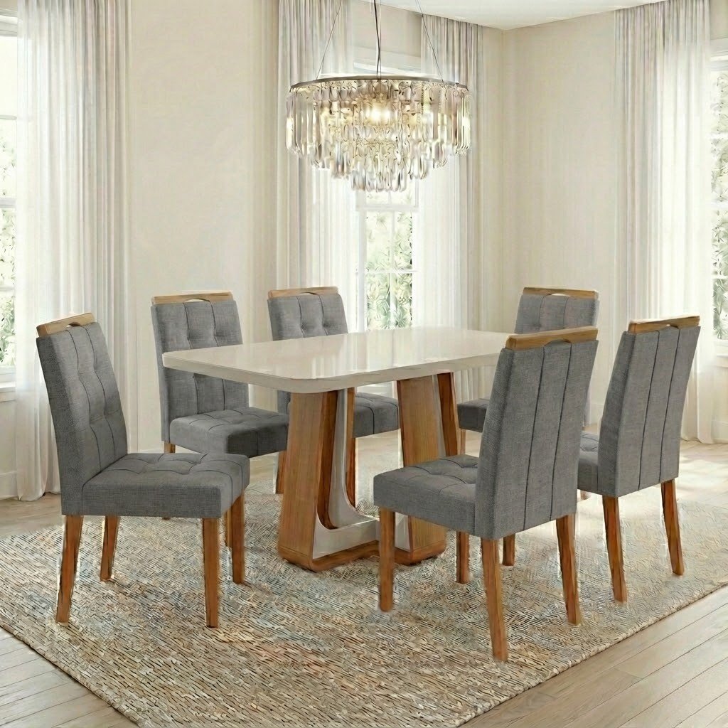 Mesa Sintonia (Tampo Maxi) 170 Amêndoa Clean/Off White com 6 Cadeiras Sophia Linho Cinza Grafite 202 – LOPAS + WM DECOR