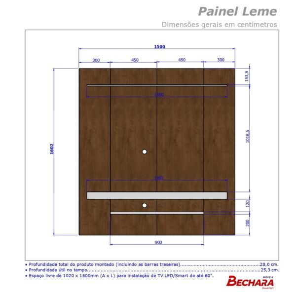– Espaço para TV (AxL): 102 cm x 150 cm