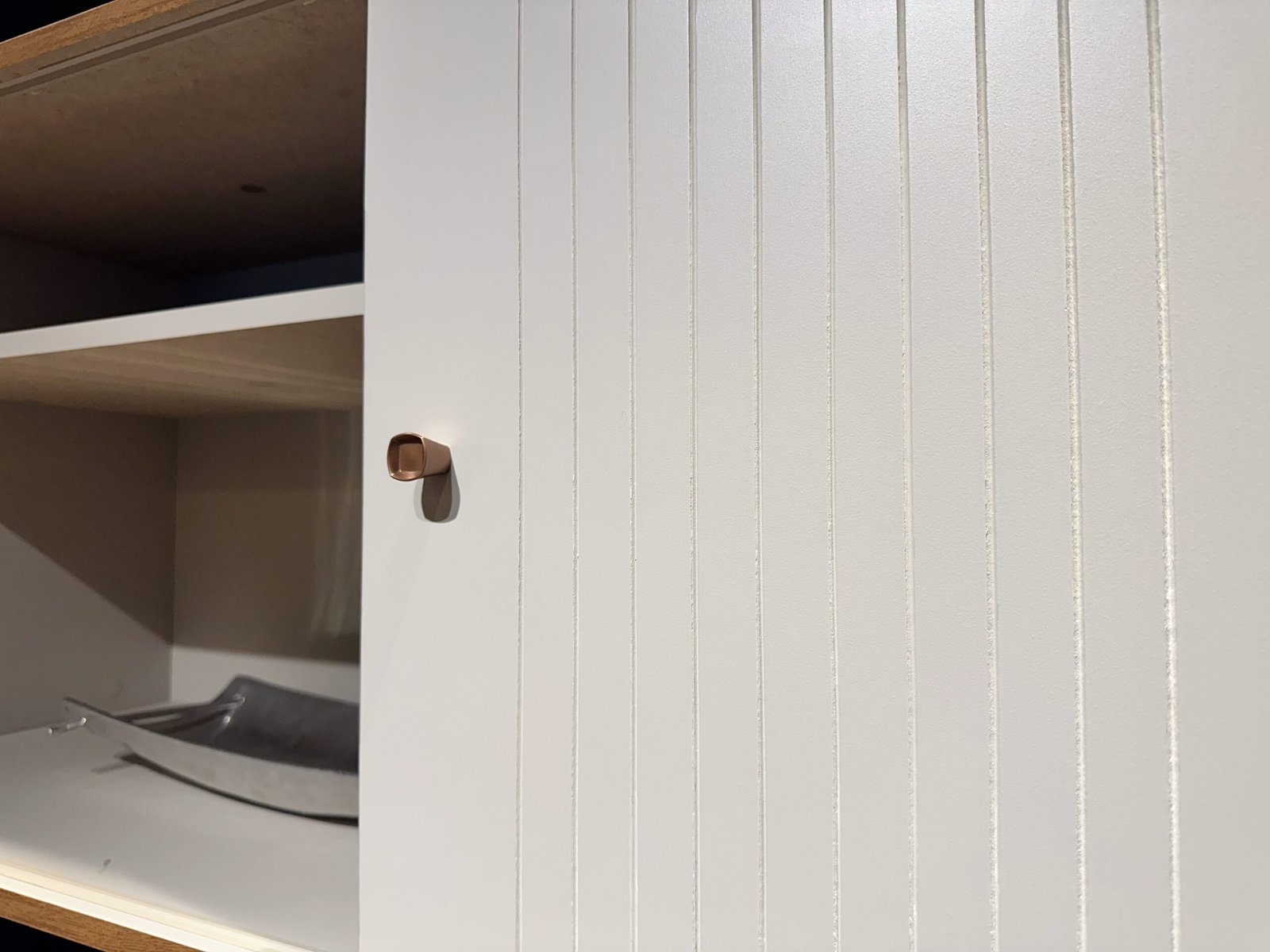 – Uma porta de correr MDF 15 mm com detalhes em frisos
