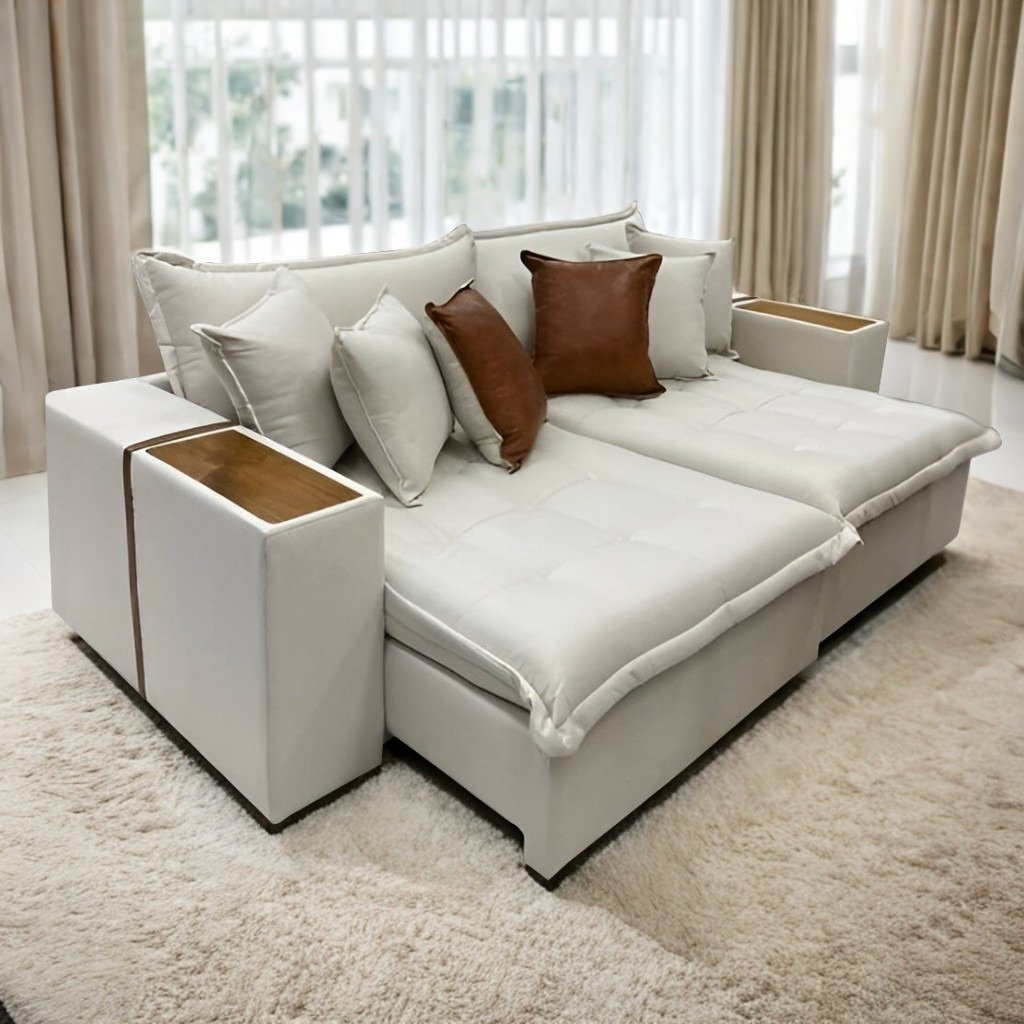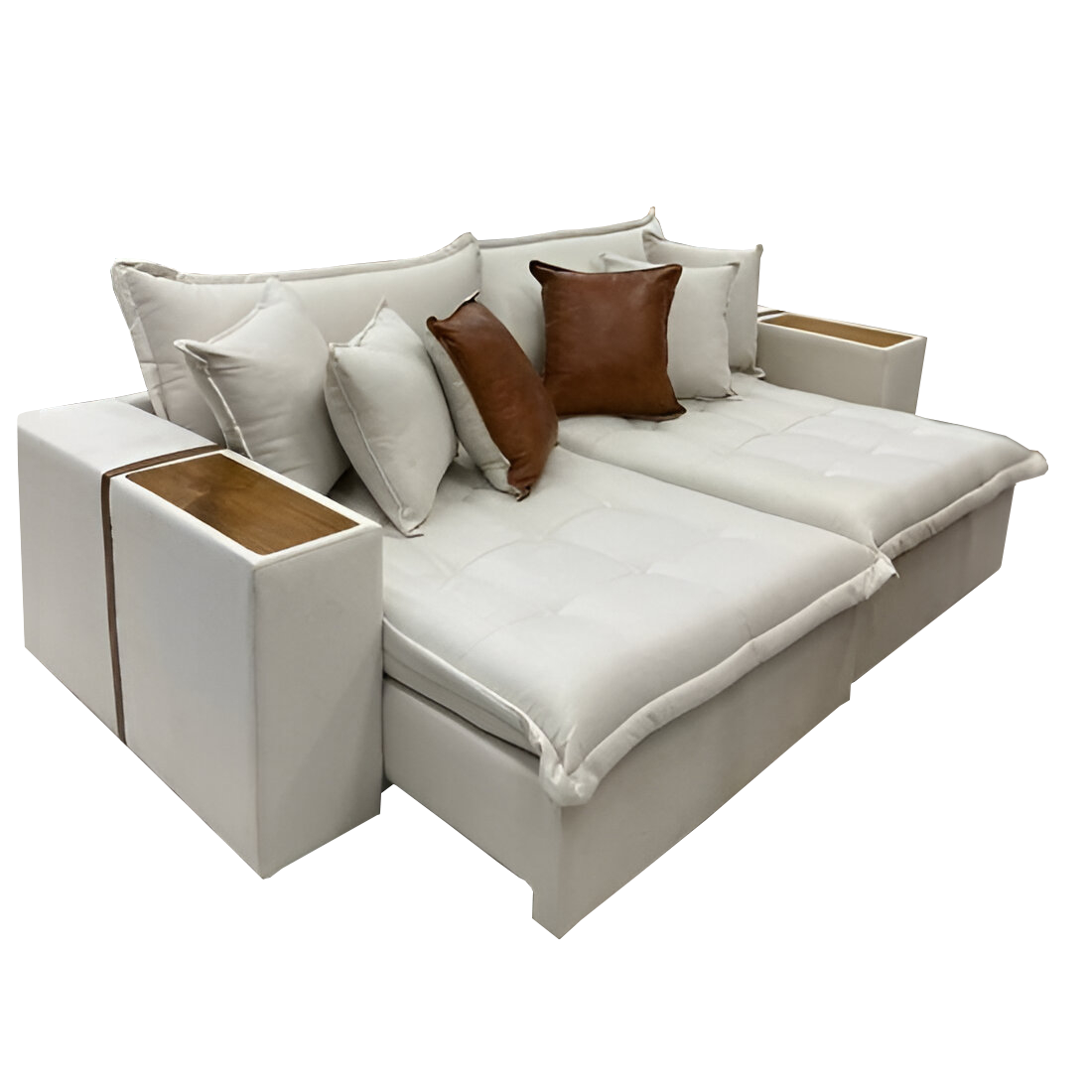 Sofá Cama Retrátil Tebas 2,95 m Linho Marfim 12/Courino Dallas 07 – INNOVE ESTOFADOS